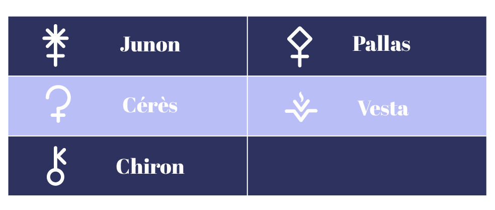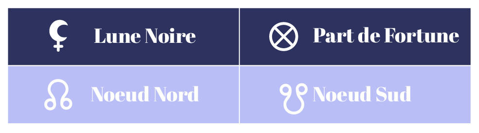 Il existe d’autres symboles qui apparaissent sur votre thème astral. Ce sont soit des astéroïdes qui sont considérés comme des « planètes secondaires », soit des points fictifs qui correspondent à des points particuliers entre les luminaires (Soleil et Lune) et entre les Luminaires et l’Ascendant, comme la Part de Fortune. Les Noeuds Lunaires qui correspondent aux deux Noeuds (Nord et Sud), ainsi que la Lune Noire appartiennent à l’astrologie karmique qui n’est pas utilisée par tous les astrologues.